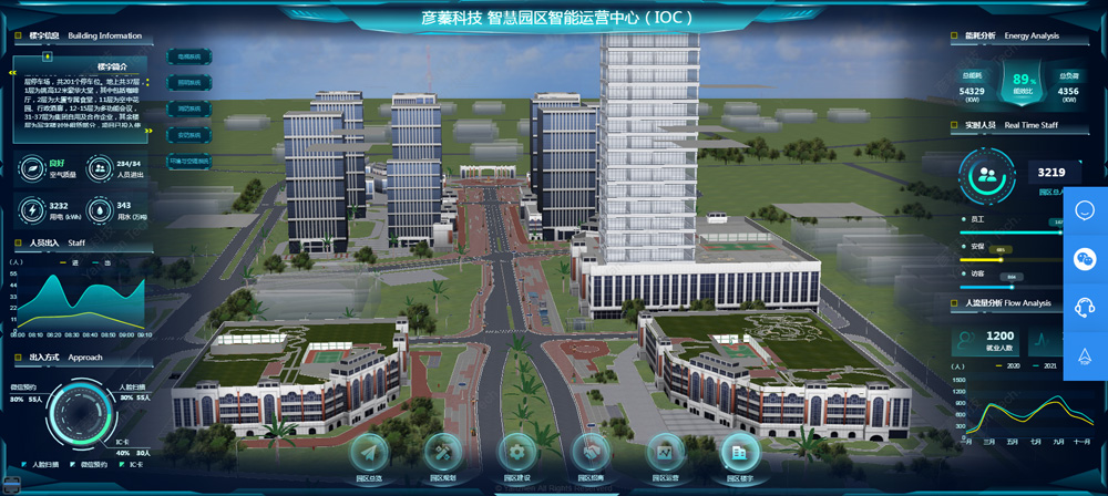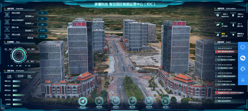 設(shè)計(jì)元素: 智慧園區(qū)智能運(yùn)營(yíng)中心(IOC)主要包括園區(qū)總面積、用地面積、園區(qū)人數(shù)、園區(qū)企業(yè)數(shù)、園區(qū)車位,空氣質(zhì)量,園區(qū)交通和園區(qū)最新事件的公布等數(shù)據(jù)整合平臺(tái)。