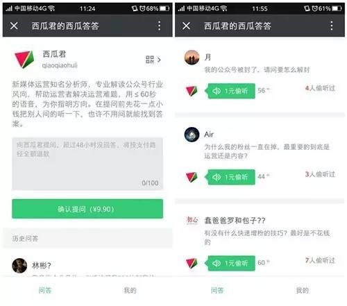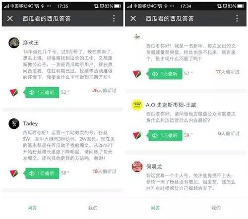 西瓜答答為運營者和用戶之間的互動搭建了更好玩、輕松、簡單的平臺,根據(jù)公眾號定位和運營者擅長的領(lǐng)域,鼓勵用戶付費提問,“用戶提問——運營者回答”,這一過程可以被全程圍觀、分享,互動形式更加活潑,讓公眾號的輕度用戶輕松過渡到重度用戶。