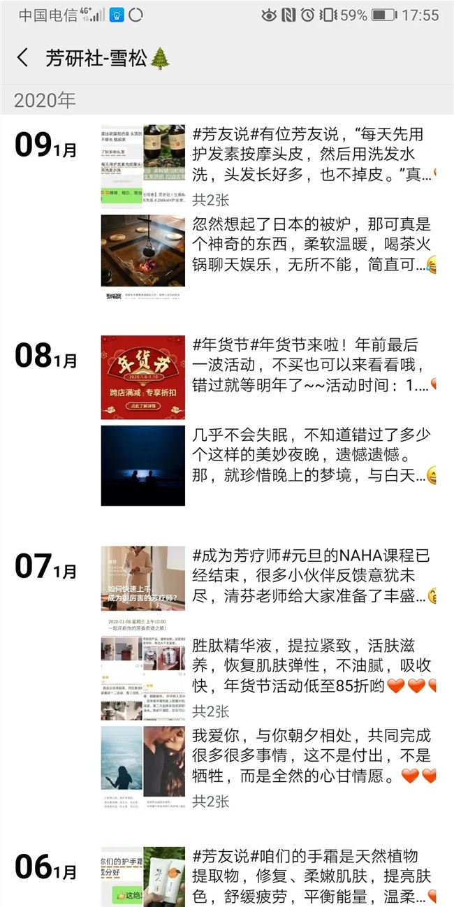 為了讓品牌的調(diào)性保持一致,芳研社格外注意對外的形象打造。比如,除去清芬本人的微信外,另外 4 個客服微信的名字“草暖、藍蓮、雪松、甜橙“均源于精油。平時,客服在朋友圈會有規(guī)律地發(fā)布內(nèi)容,包括三分之一芳療和護膚知識,三分之一的生活美學(xué),還有三分之一的活動通告、創(chuàng)始人日常、直播與微課預(yù)報、芳友返圖等等。當然,芳研社的客服也會積極對用戶的朋友圈進行點贊和評論。