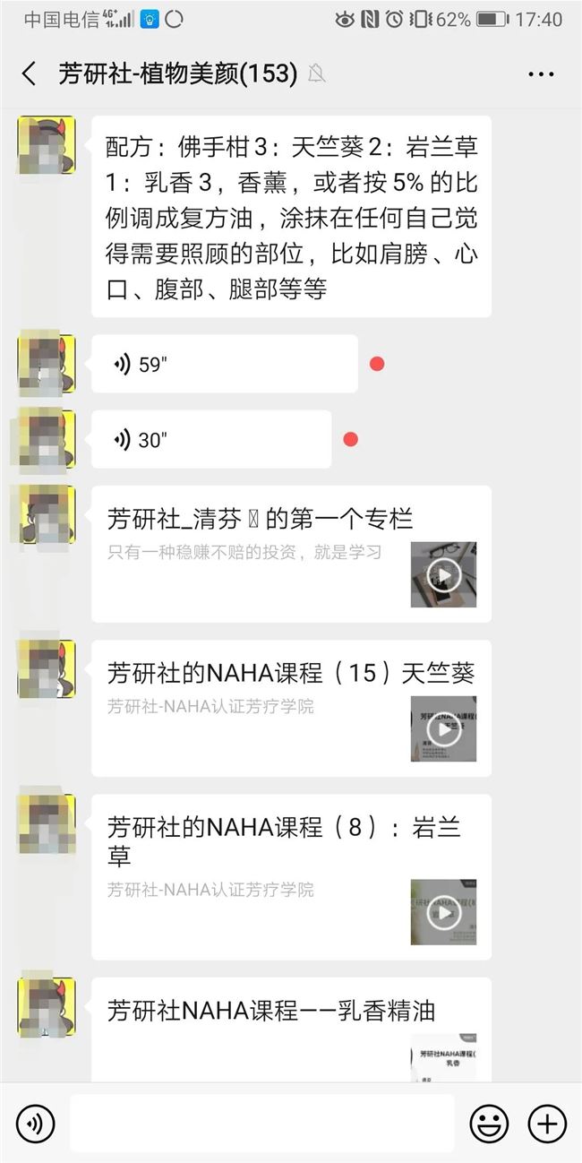 在社群內(nèi),除了日常圍繞芳療洗護進行話題討論及售后交流外,固定活動是每周一次的線上社群微課分享。微課以精油為核心,涵蓋護膚、護發(fā)、芳療、育兒、生活美學(xué)等女性相關(guān)的方方面面。例如,《芳研社的正念護膚課》、《芳研社的NAHA精油課》等。這部分課程主要由清芬研發(fā)和打磨,內(nèi)容方向主要是根據(jù)用戶需求以及清芬個人的興趣和學(xué)習研究進度而定。最近清芬也開始嘗試在社群內(nèi)分享日志,與芳友們分享生活中的點滴。而Leona除了負責線下課程外,也在研發(fā)《芳香心理學(xué)》、《精油化學(xué)》等部分線上課。