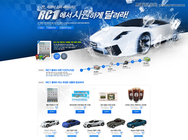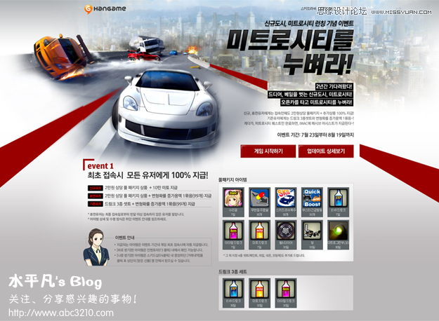 上圖,將賽車在賽道上疾馳的場(chǎng)面置放到頁(yè)面上作為背景,虛化的大城市,放大的賽道,飛奔的賽車……就像此刻坐在電腦前玩賽車,左手正緊緊按著W、A、S、D鍵一樣。讓用戶身臨其境,完全抓住了對(duì)方眼球。