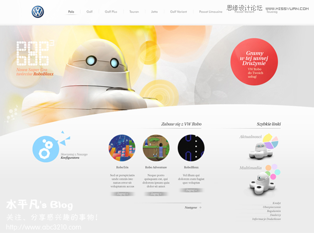 上圖中,大眾的logo和焦點(diǎn)圖中的機(jī)器人產(chǎn)品,全部由曲線組成,這種情況下,用曲線來(lái)分割背景和焦點(diǎn)就顯得理所當(dāng)然了,畫(huà)面中曲線合理的運(yùn)用也提高了層次感,機(jī)器人和紅色標(biāo)題都更突出。