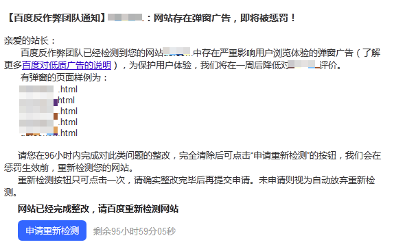 彈窗是一個(gè)困擾著廣大站長(zhǎng)的問(wèn)題,百度在2014年7月推出了“整改反饋功能”,即發(fā)現(xiàn)網(wǎng)站存在影響排名的問(wèn)題,會(huì)通過(guò)站內(nèi)消息、郵件、短信通知站長(zhǎng),如果站長(zhǎng)確認(rèn)此問(wèn)題存在可以整改后反饋給百度,百度會(huì)重新審核撤銷懲罰,目前最常見的是收到“網(wǎng)站存在惡劣彈窗,請(qǐng)馬上整改避免懲罰”的整改信息。