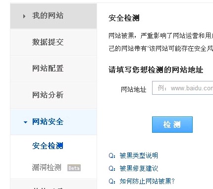 對(duì)于第一種情況,網(wǎng)站被入侵,可以通過(guò)百度站長(zhǎng)平臺(tái)的安全檢測(cè)工具,檢查自身網(wǎng)站的安全情況。