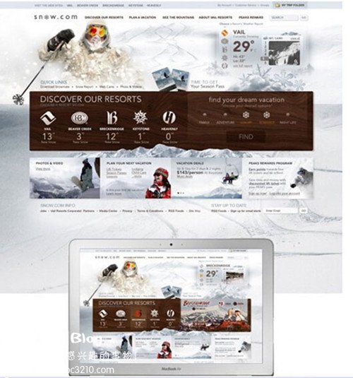 例如:關(guān)于旅游型的網(wǎng)站,不一定要出現(xiàn)景點(diǎn)酒店等主題,直接找自然的景作為主題,就像雪這么單一的色調(diào)設(shè)計(jì)出來的網(wǎng)站也能與眾不同。